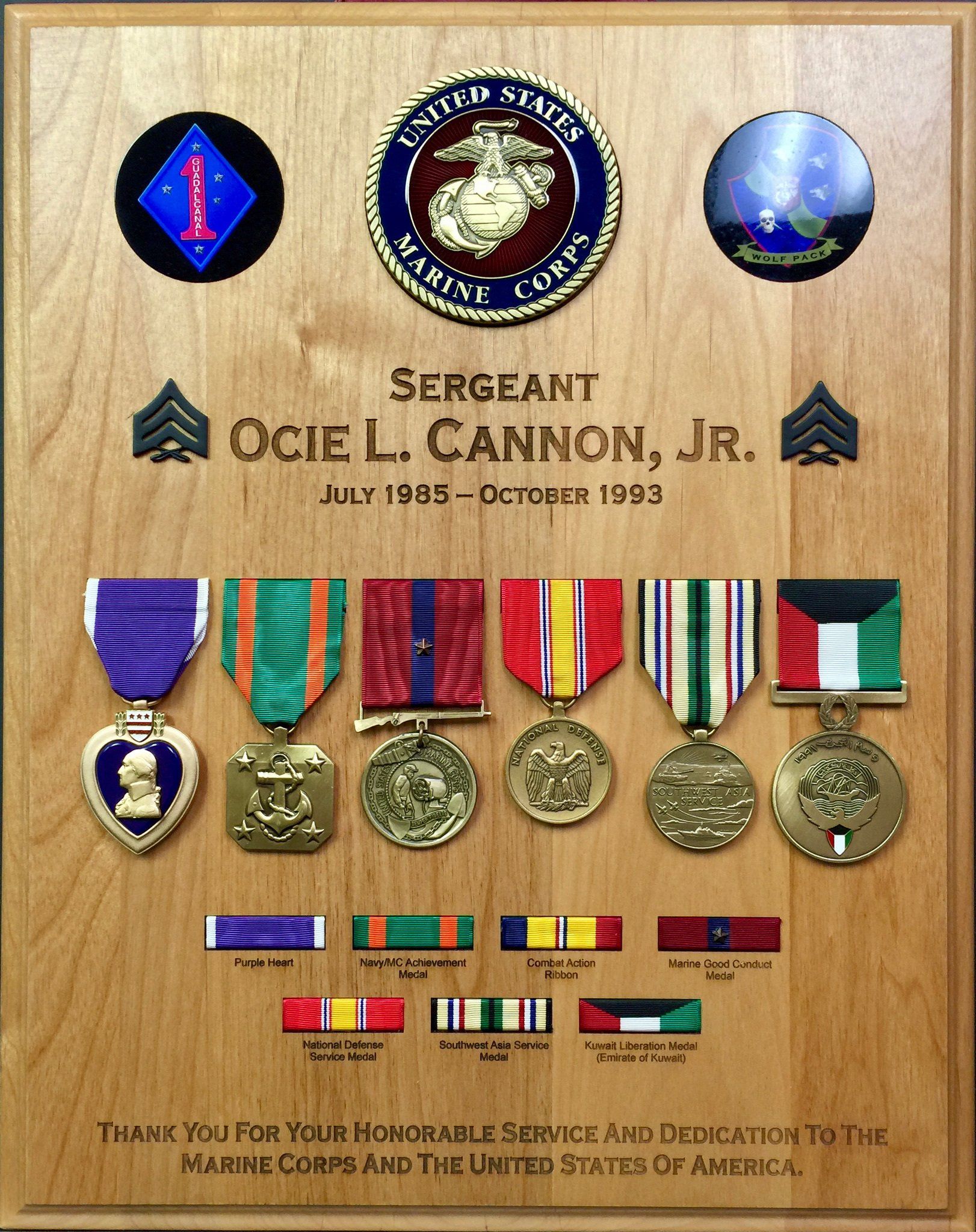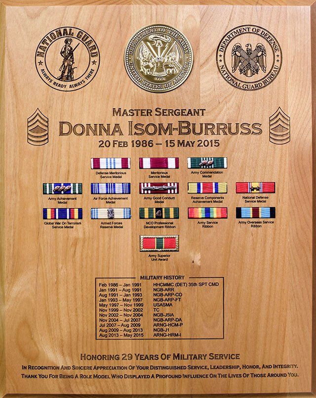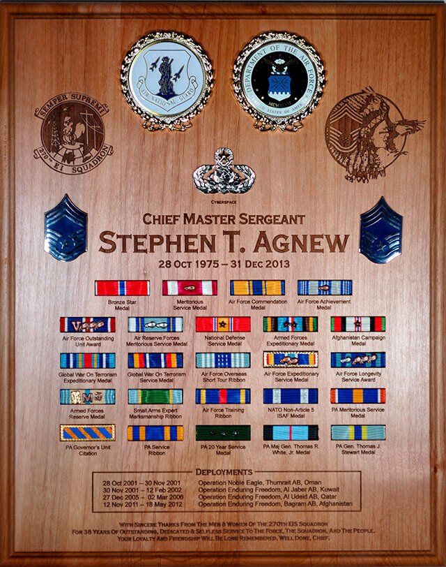 Looking for something to succinctly showcase your military service but not require an entire wall? Something you can proudly, yet modestly, show your service at your follow on career? Looking for something that won't break the bank? For many military units, friends, and family members, these one-of-a-kind, personalized heirlooms have turned out to be the perfect retirement gift. Please review the service galleries to see the surprising variety of ways a small plaque can beautifully summarize a complete military career.